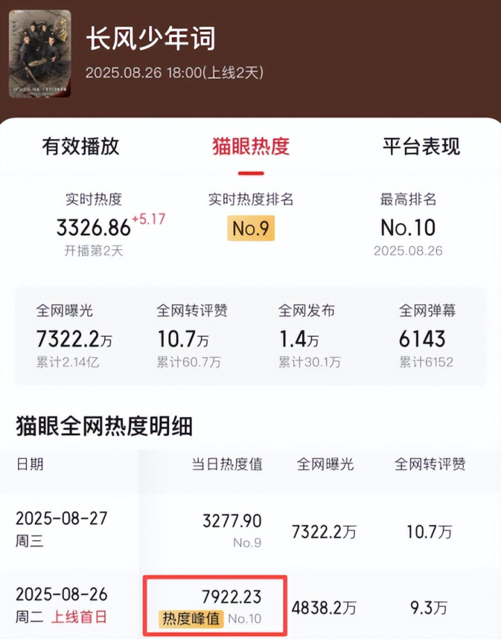 《长风少年词》上线芒果TV,仅播4集热度轻松破7900。